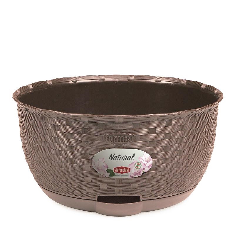 Ciotola in finitura rattan, dotata di riserva d'acqua per una corretta irrigazione della pianta.