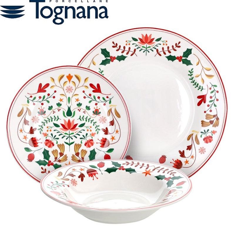 Dona un tocco di colore e originalità alla tua tavola con il servizio piatti 18 pezzi Winter Folk in porcellana, decorato con una vivace fantasia floreale ispirata allo stile natalizio folk. Il design presenta eleganti motivi rossi, verdi e dorati che richiamano la magia delle feste, mantenendo uno stile moderno e raffinato. Il servizio piatti Winter Folk è lavabile in lavastoviglie ed idoneo all'utilizzo in microonde.