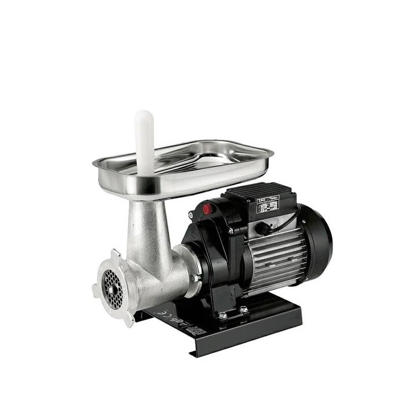 Tritacarne per uso domestico – Motore a induzione a servizio continuo – Riduttore con ingranaggi in nylon e acciaio a bagno d’olio, che non necessita di manutenzione, sostituzione, rabbocco – Tritacarne in ghisa stagnata, trattata per uso alimentare – Piatto in acciaio inox AISI 304 – Produzione oraria: 50/90 kg – Adatto anche per insaccare con gli appositi accessori (imbuti insaccatori, corona di supporto)
